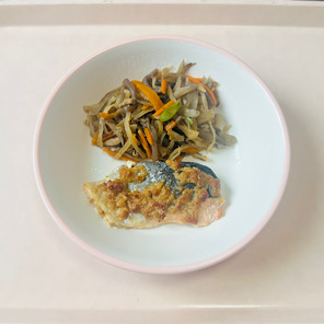ごはん わかめの炒め煮 ますのごまマヨネーズ焼き 五目きんぴら 里芋と油揚げの味噌汁