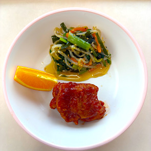 ごはん ヤンニョムチキン もやしのナムル 豆腐と卵のスープ オレンジ