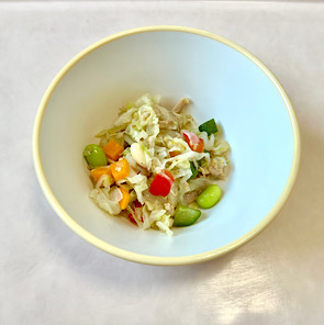 キャベツ(短冊)    120g きゅうり(角切り)   40g にんじん(角切り)   24g 赤パプリカ(角切り)  12g 冷凍えだまめ      12g 乾燥大豆        8g まぐろ缶詰 (油漬フレークライト) 20g 白いりごま       5g サラダ油        小さじ1 酢           大さじ1 塩           少々 白こしょう       少々 しょうゆ        小さじ1 三温糖         小さじ1 レモン汁        少々